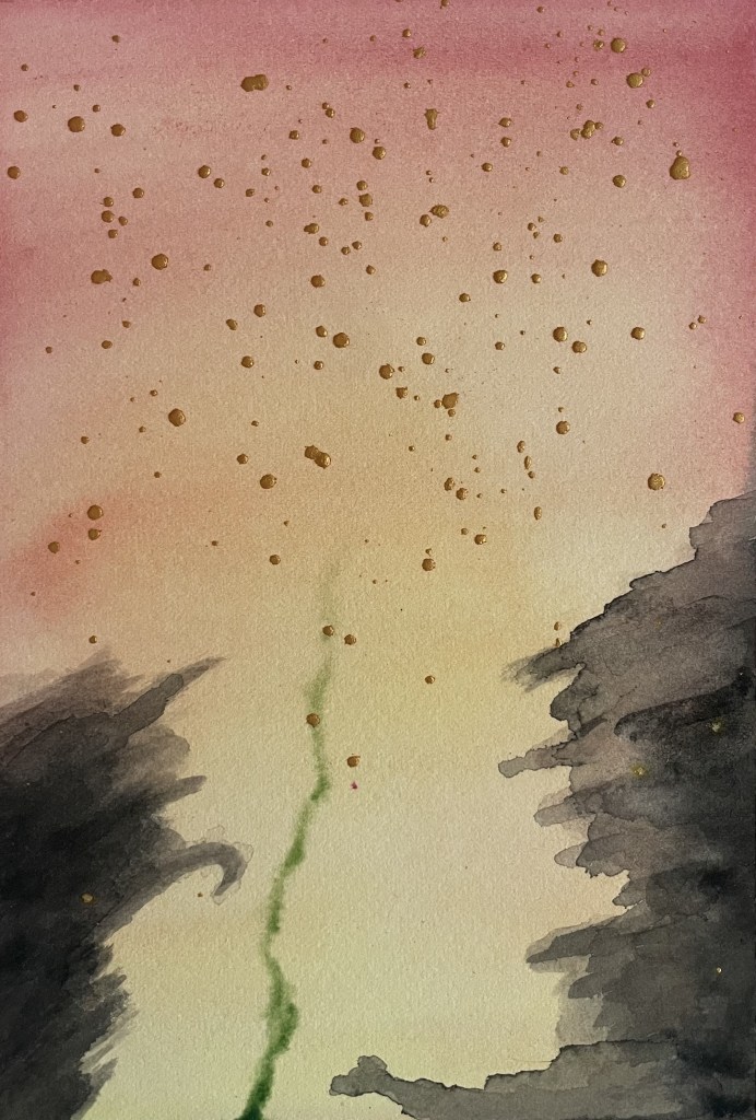 In this picture I painted a few years ago in a watercolor class, I tried to show my spiritual life: beset by evil that cannot succeed. All the while I keep growing toward light and freedom, and mercy drops keep falling on and around me.