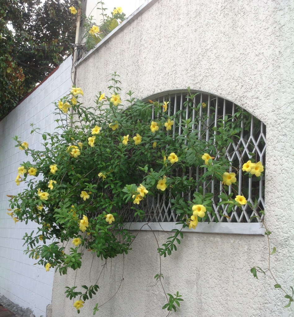 It is like the single yellow trumpet flower that bloomed years ago, the first and only flower this plant had ever produced. I had planted the trumpet vine to try and cover an ugly shed in the garden of the house we were renting. The single flower bloomed on my physical birthday. In later months the vine went on to bloom profusely right over and through the grates of the garden wall (picture at top).